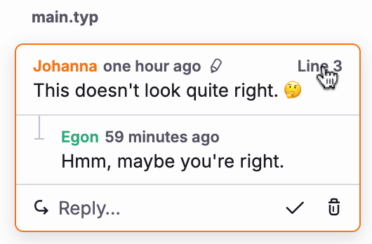 Typst Pro's comments are a great way for other people to give feedback on your document. They can be attached to a range of text and stick to it as you're collaboratively editing the document. Comments will be highlighted in the editor with a yellow background and a little comment icon in the gutter (where the line numbers are located).